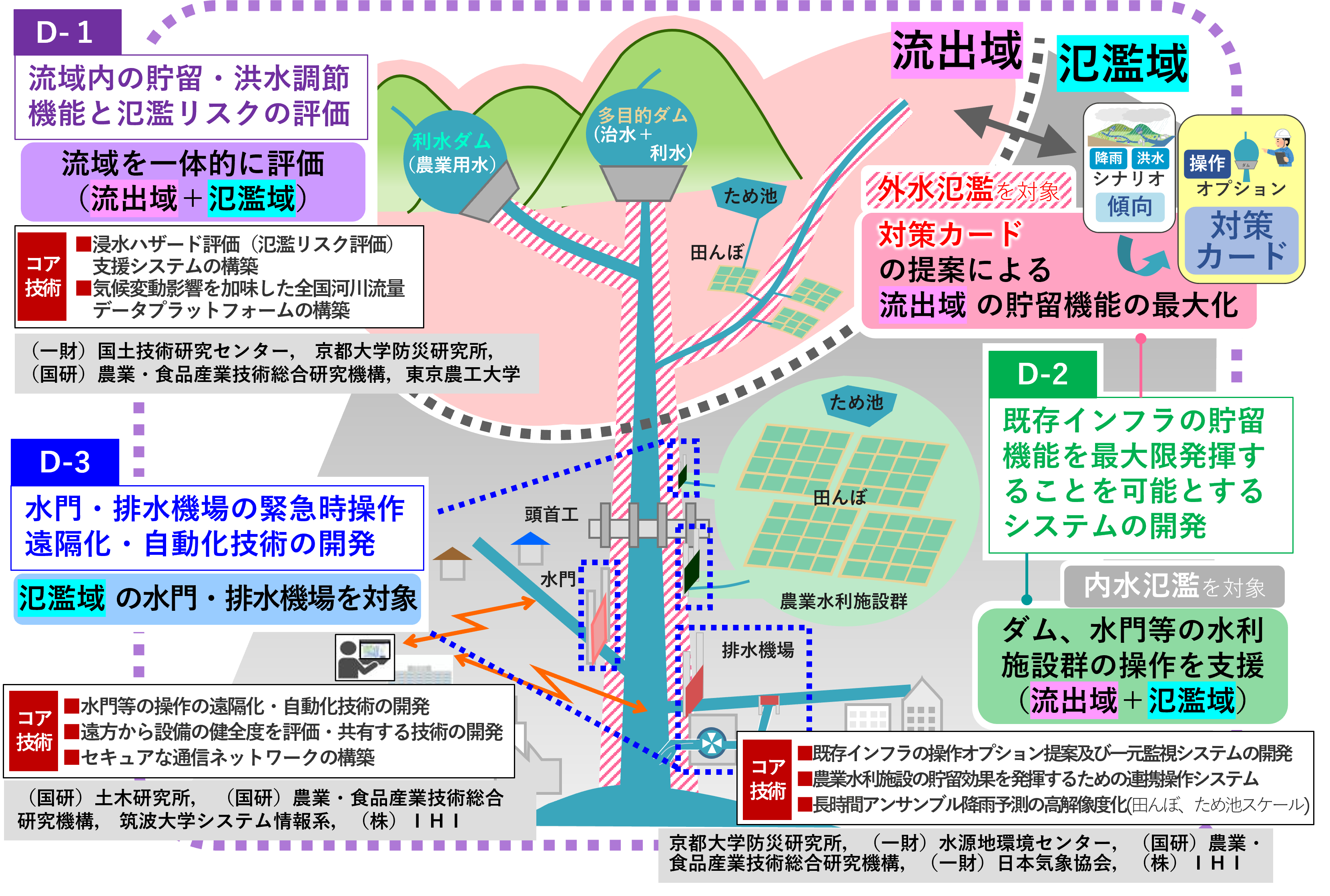 SIP第3期課題「スマート防災ネットワークの構築」のうち、流域治水の実践的な取組の一環として、国土交通省・農水省をはじめとした関係省庁及び流域の関係者が連携することで、既存インフラを活用して流域全体としての治水効果を最大化することを目標として研究開発に取り組んでいるサブ課題です(サブ課題D)。