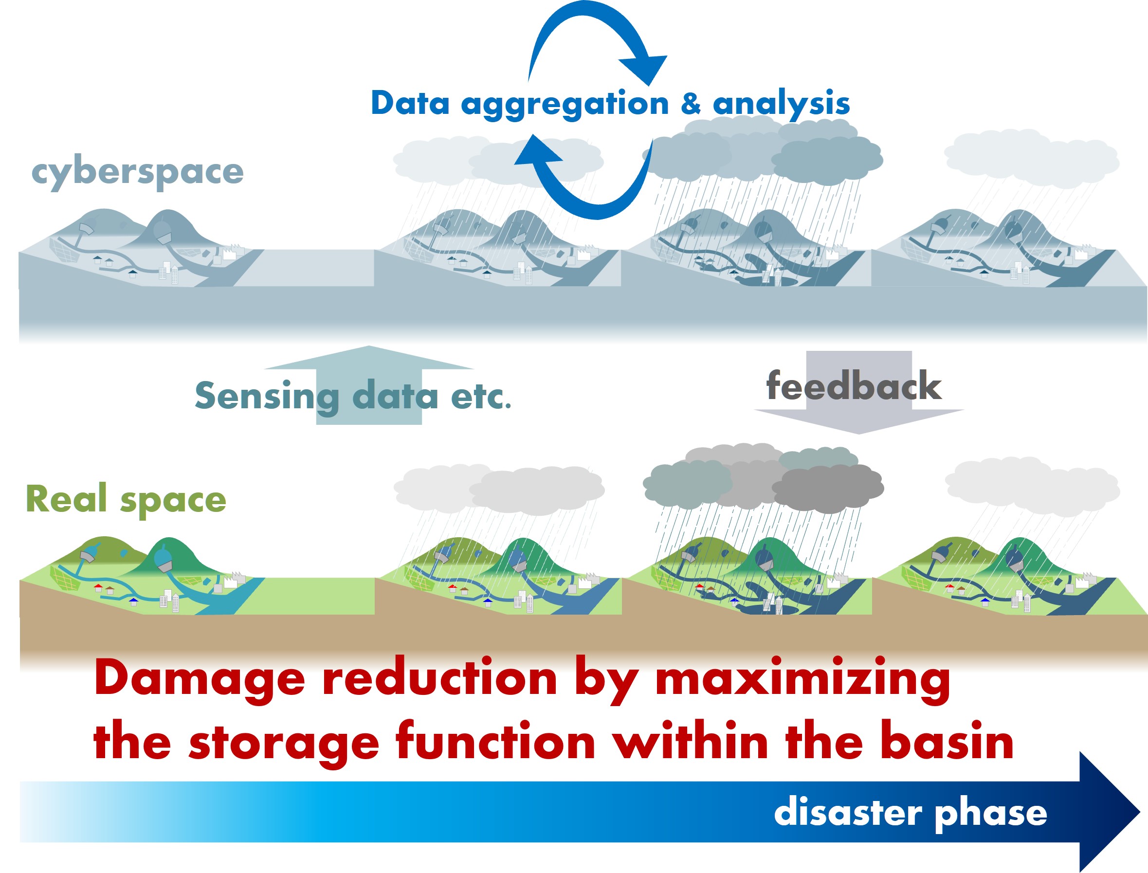 流域治水の実践的な取組の一環として、流域の多様な関係者が連携することで、既存インフラを活用して流域全体としての治水効果を最大化することを目標に研究開発に取り組んでいます。