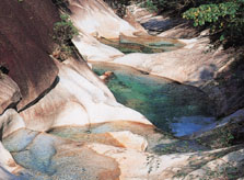 | 原生林が生い茂る桑原川の渓谷。巨大な花崗岩の一枚岩が削られた奇観とおう穴群がつづき、渓谷沿いにバンガローや温泉キャンプ場などが整備されています。 |
