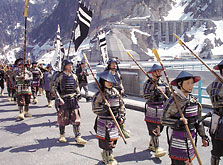 雪に閉ざされたアルペンルートに春を告げるイベント。富山城主佐々成政(さっさなりまさ)一行によって行われた厳冬の立山越え「さらさら越え」を再現します。