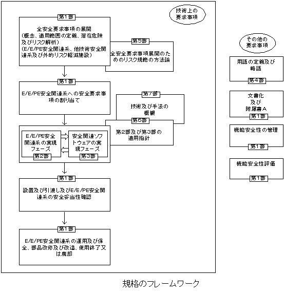 1つまた は複数の電気式機器/電子式機器/プログラマブル電子式装 置を組み込んだシステムの安全性に関して適用されるもので、機器・システムの全ライフサイクル(初期概念構想→設計→開発・製作→実施・運転・保守→廃 棄)に対して適用する。