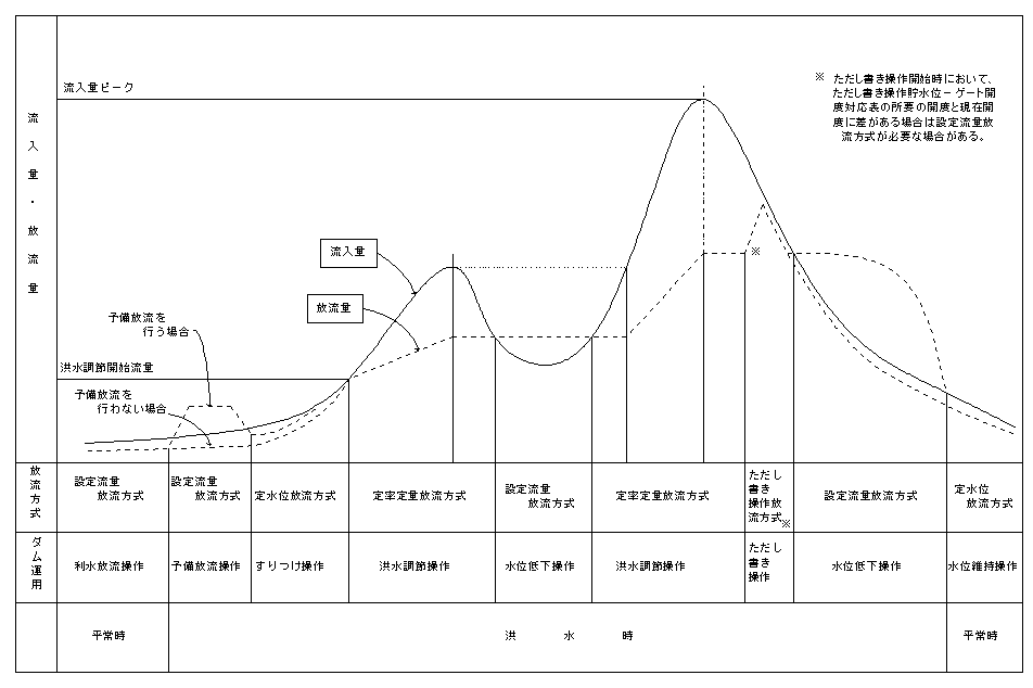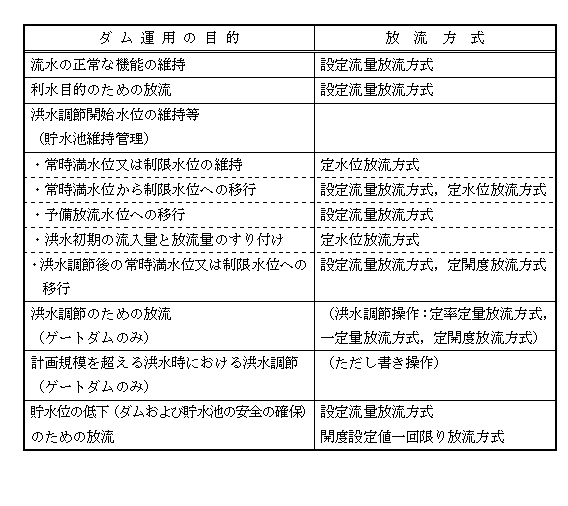 には、定率定量放流方式、一定量放流方式など種々の方式があり、その操作は予め定められた操作規則・操作細則に規定された内容に従い実施される。また、平