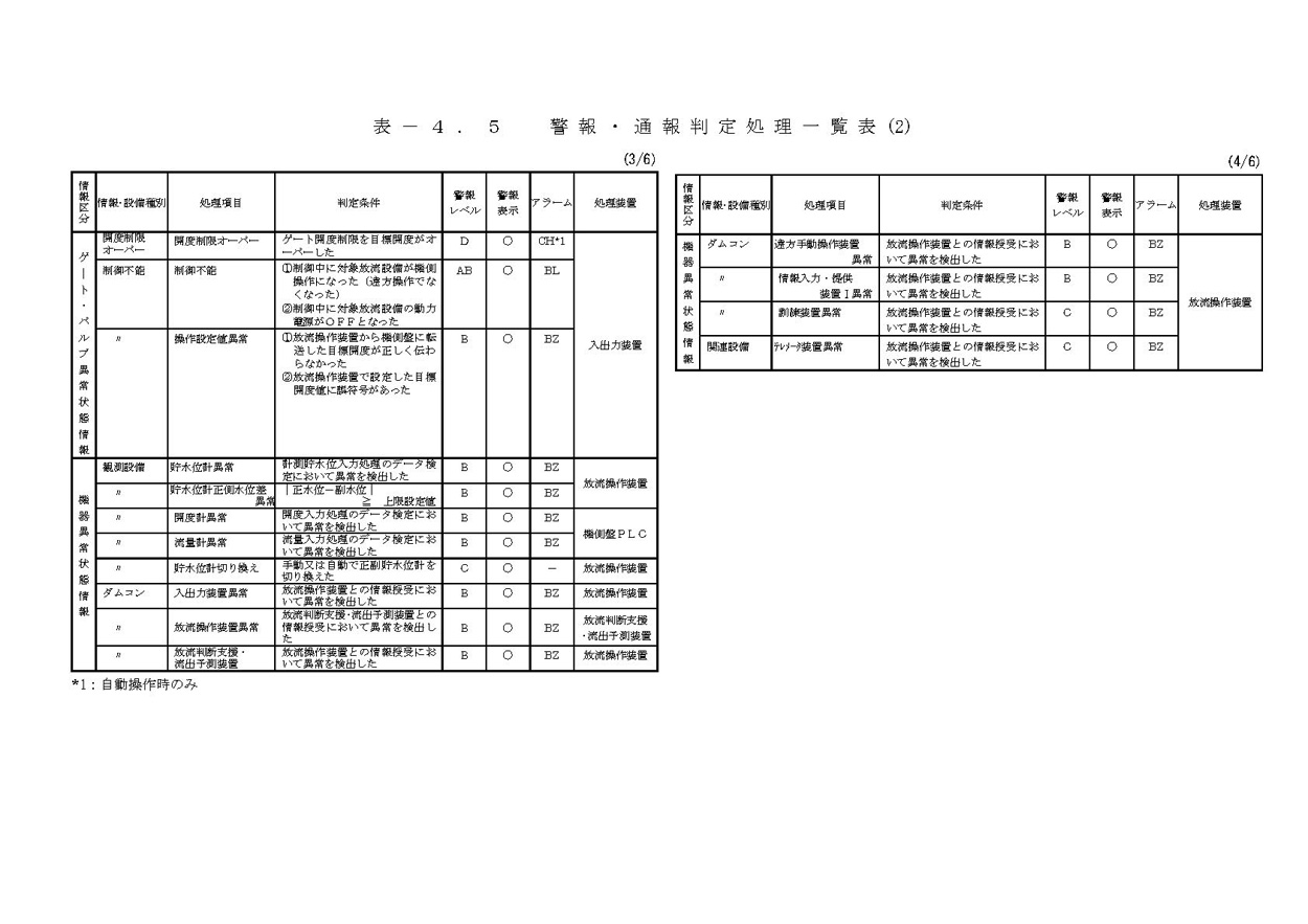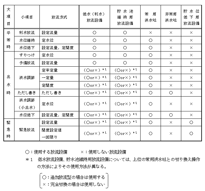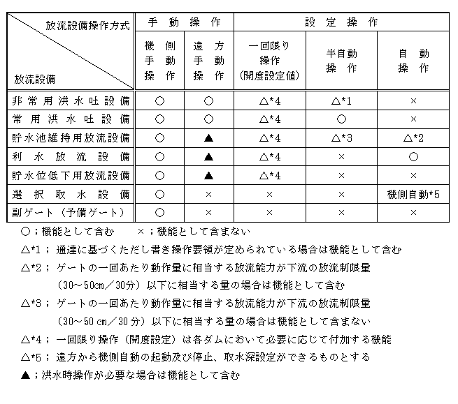 ものとしている。なお、洪水調節操作及び洪水初期のすりつけ操作に利用する利水放流設備(バルブ)については遠方手動操作機能を具備するものとする。