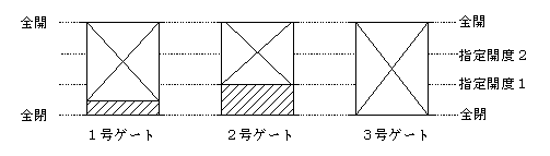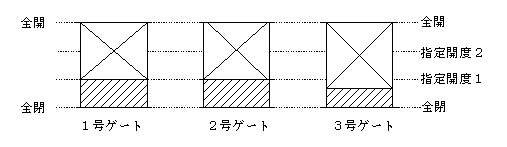 (※) 除外:ゲート設備や伝送路上の障害が発生し、遠方からの操作 制御が不可となった場合に、当該ゲートの操作を一時停止させ、それ以降の操作対象からはずす(除外)ことをいう。ゲートが中間開度で除外となった場合は、 その開度を固定し、残りの正常なゲートを用いて放流を継続する。自動除外ゲートの全閉操作は遠方からの制御が不可の場合、機側で行う必要がある。