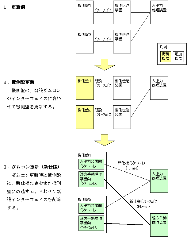 機側盤先 行更新のケースでは、機側盤更新時に既設ダムコンのインターフェイスに合わせ更新し、その後ダムコン更新時に、インターフェイスをFL−net方式に変更 する。