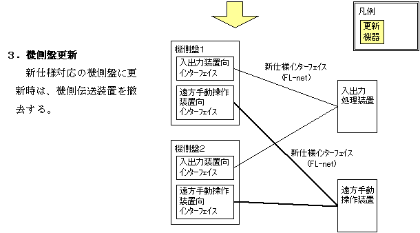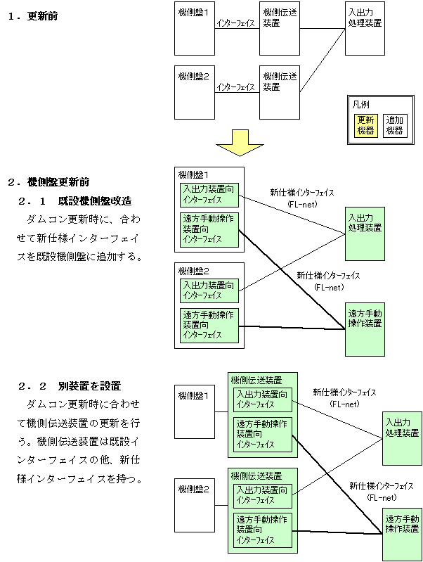 ダムコン を先行して更新する場合は、機側盤更新までは本仕様書に対応したインターフェース(FL−net方式)が必要となるが、このインターフェースは機側盤更新 後は不要となり、撤去することになる。
