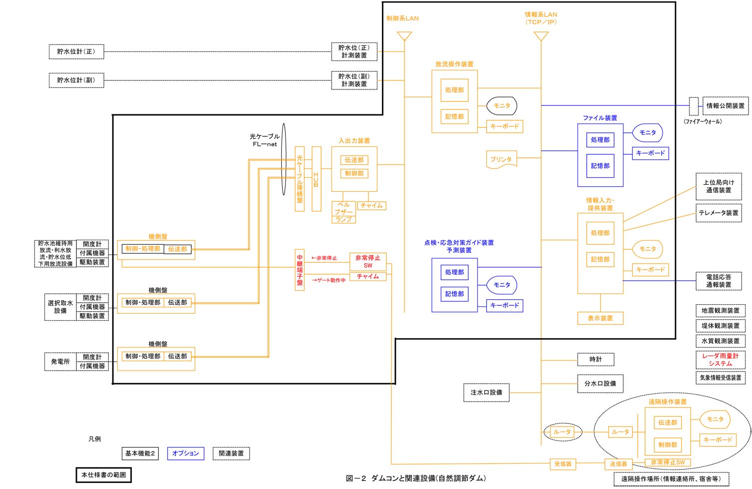 (1) 本仕様書で規定する設備は実線内の装置を基本とし、これに係わるソフトウェアも対象とする。本装置群については、対象ダムの特性に応 じた機能の選択に基づき計画するものとする。従って、本仕様書に規定されていてもダムによっては必要としない機能ならびに装置については、オプション機能 (機器)として、表現している。各設備の役割及び機能分担については2章で述べる。