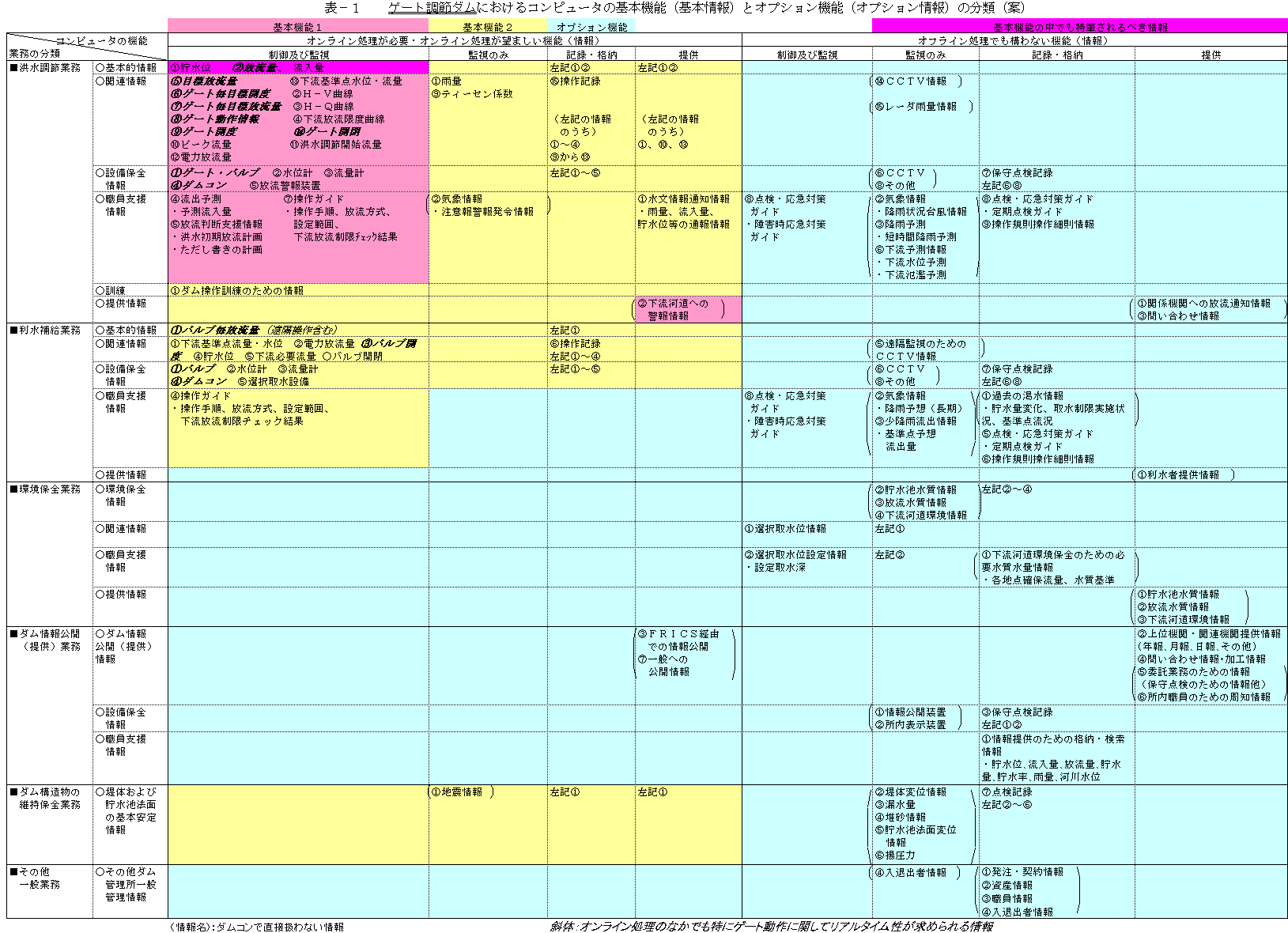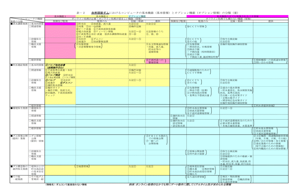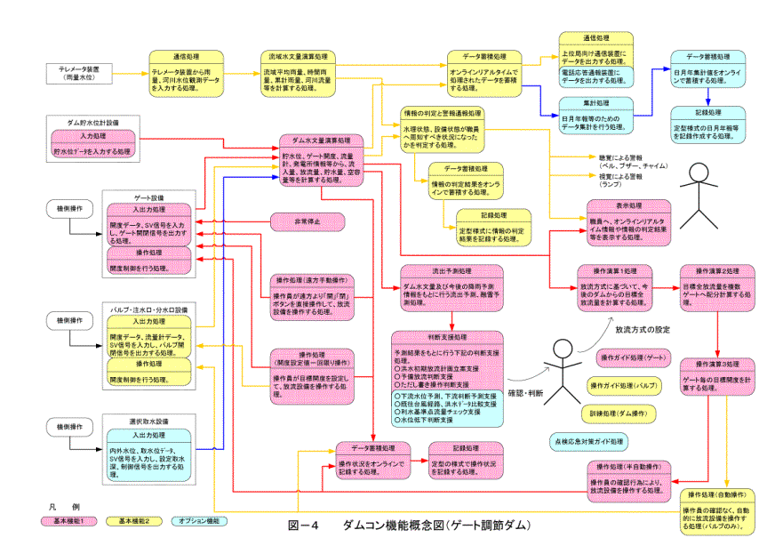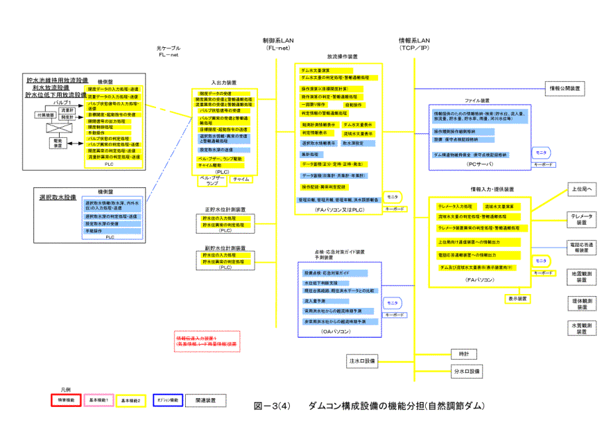 (4) 本仕様書では、ダムコンの処理機能について、「基本機能」と「オプ ション機能」とに分類し、オプション機能については、ダム毎に取捨選択を行うものとしている。基本機能は、操作規則に規定されているダム管理の主要な管理 業務を支援するものを分類しており、基本機能とオプション機能それぞれの重要度に応じた信頼性を確保することが必要である。基本機能とオプション機能の考 え方については後述する。