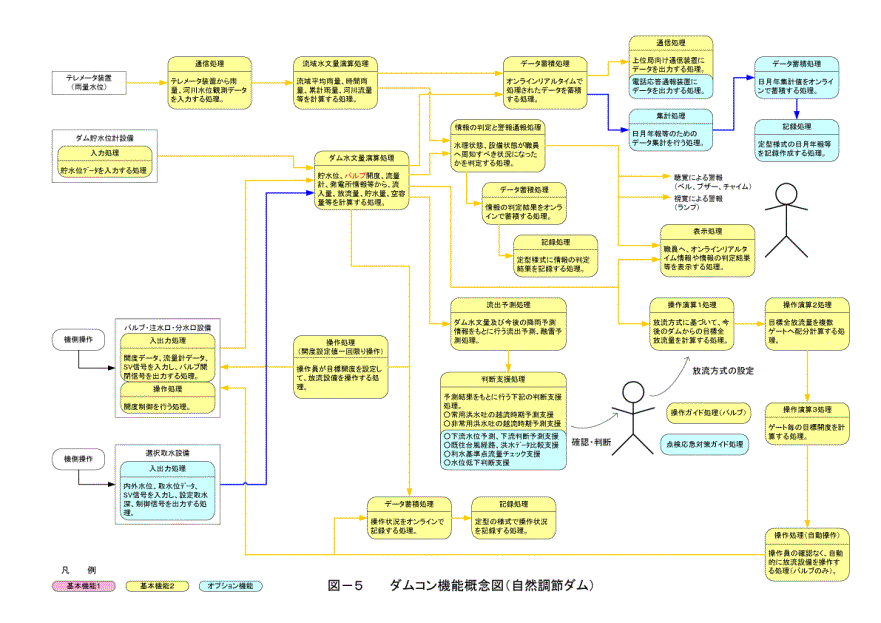 自然 調節ダムのダムコンは、洪水時のゲート操作処理機能が不要となることから、システム全体の安全性、信頼性はゲート調節ダムのダムコンとは異なる。本仕様書 では、ゲート調節ダムと自然調節ダムの特性を考慮し、その設計の考え方、ダムコンの有する機能をとりまとめた。