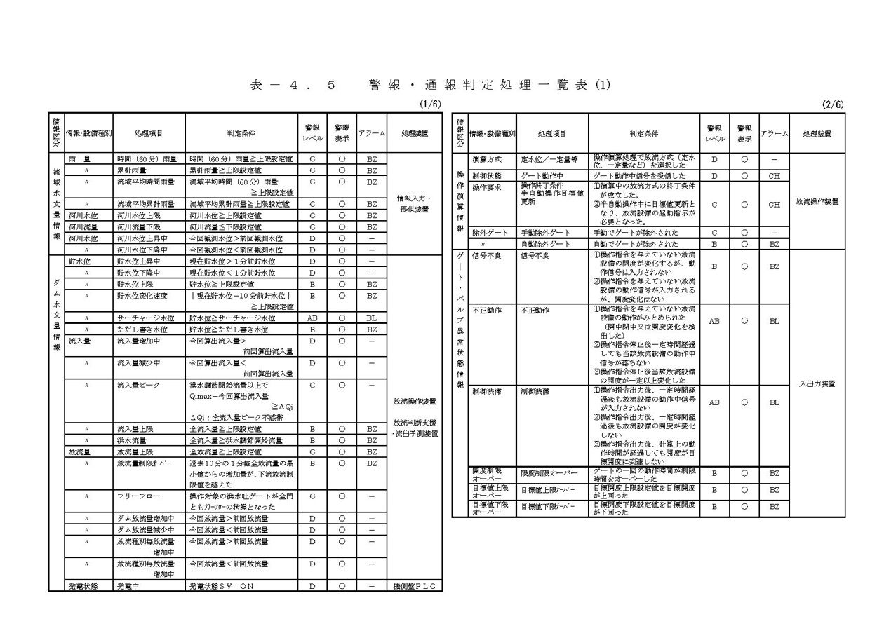 (4) 更新時においては、@ダムコンだけを更新する場合、Aゲート機側盤を含めて更新する場合、Bテレメータ等その他関連装置を含めて更新 する場合などダムにより設計の前提条件が異なる。テレメータ等その他関連装置を含めて更新する場合は、周辺設備を含めて本仕様書の適用が可能となるが、@ 及びAの場合は、既存のシステム機器との整合をとりながらダムコンの計画設計を行うことが必要である。